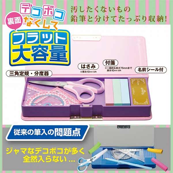 裏面には三角定規や分度器は重ねても問題なく収納できます。ハサミは厚み10mm、付箋は長さ75mm・厚さ10mmまでの大きさが入ります。