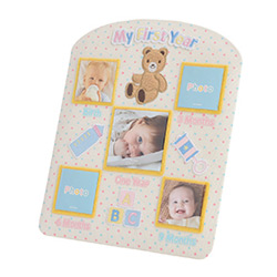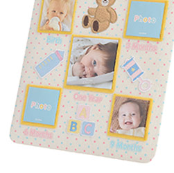 お子様の成長記録をおしゃれに可愛く残しておけるアイテム。お好きな写真を5枚まで飾ることができます。