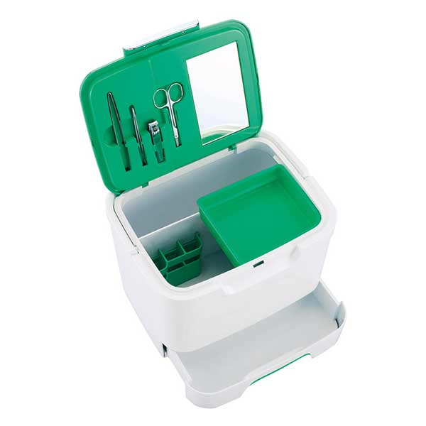 救急セット(爪切り、毛抜き、ピンセット、ハサミ)※フタの内側にセットされています。(フタ内側にはミラー付き。)