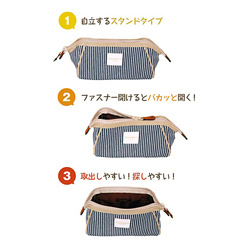 がま口のようなフォルムが可愛いポーチです。自立するスタンドタイプだから、ポーチの中身も取り出しやすい!