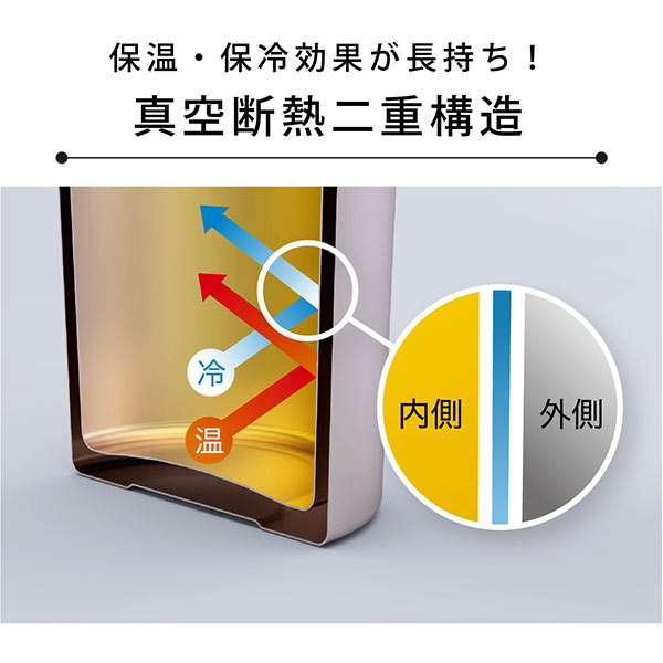 冷たい飲み物を入れても結露せず、熱い飲み物を入れても外側が熱くなりません。