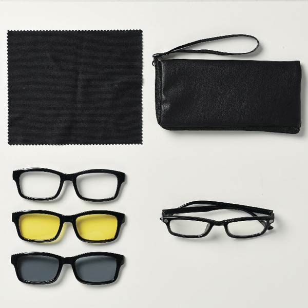 パソコン作業にはブルーライトカット、読書や細かな作業には拡大鏡、眩しい日差しには昼用サングラス、雨や夜間には黄色いレンズの専用グラス。カチッとはめるだけで早変わり!
