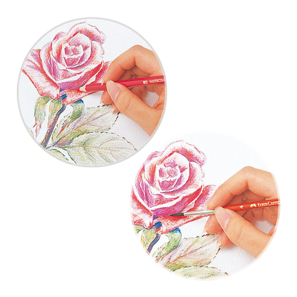 普通に色鉛筆としても使用できますが、描いた後に水を含ませた筆で上からなぞれば、水彩画のような豊かな表現も可能。