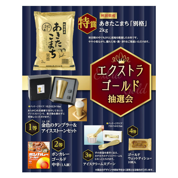 金色のタンブラーや秋田県産のあきたこまち、アイスクリームスプーンなど金色づくしのアイテムを揃えた、100人用の抽選会キットです。