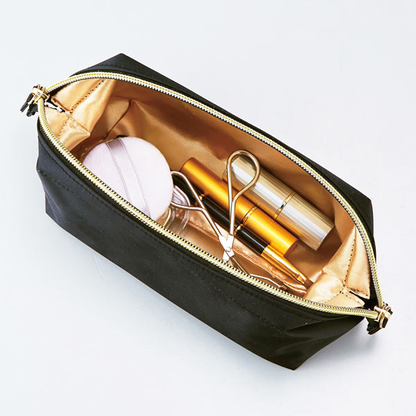落ち着いたブラックカラーに、バッグ内部に使用している上品なゴールドサテンの生地がエレガントな大人の雰囲気を演出します。
